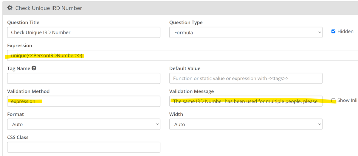 Asked on May 17, 2023 I need to check that each person in my form enters a unique IRD Number - how can I add validation to check that? 1 Answers Answer by Anonymous ✅ (Accepted) Add a hidden formula element outside of your repeater as follows…