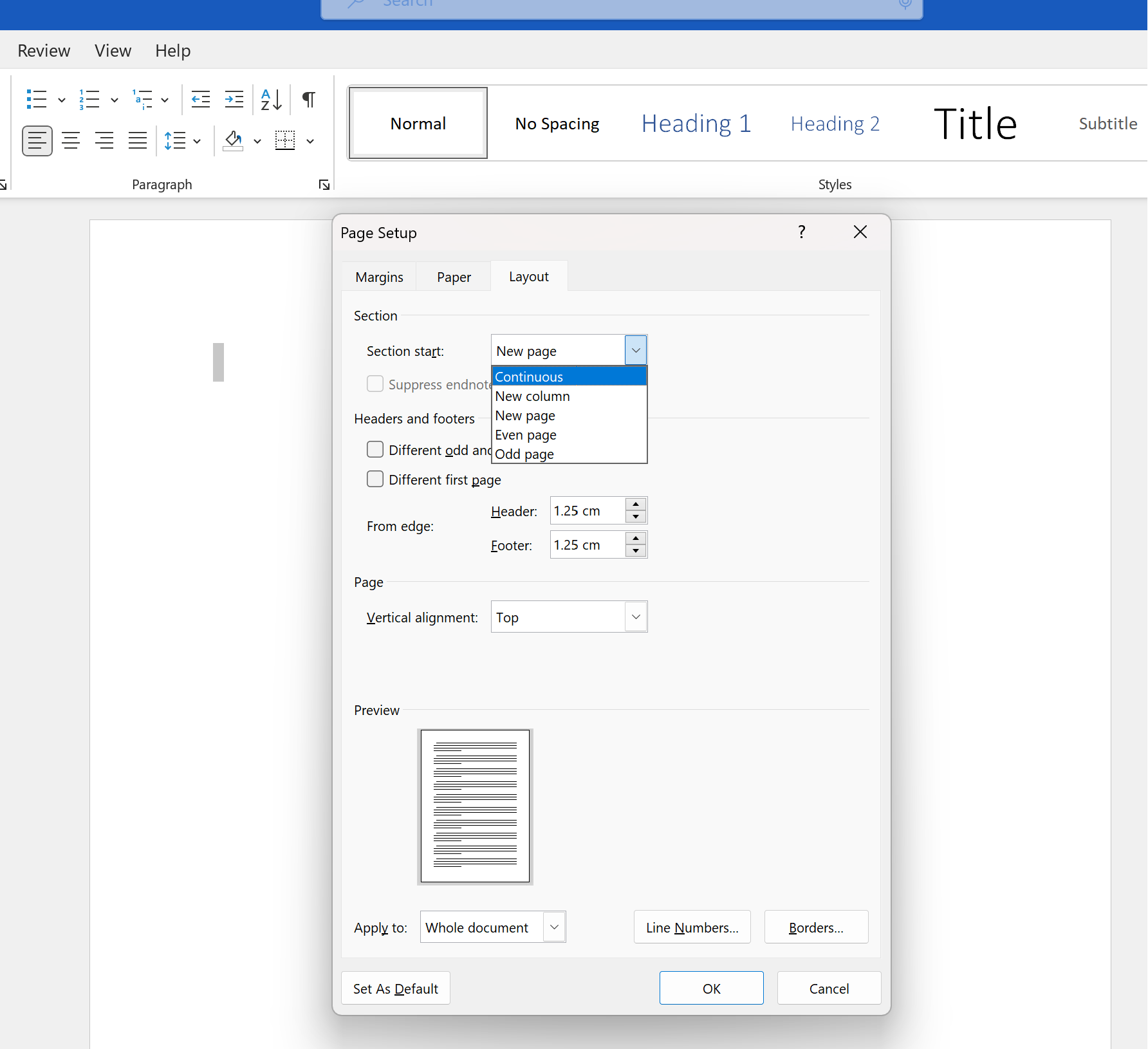 Create a new Word document to use as a template. Go to Page Setup, and then Layout. Change “Section start” to Continuous instead of New Page. Upload this template to your integration.