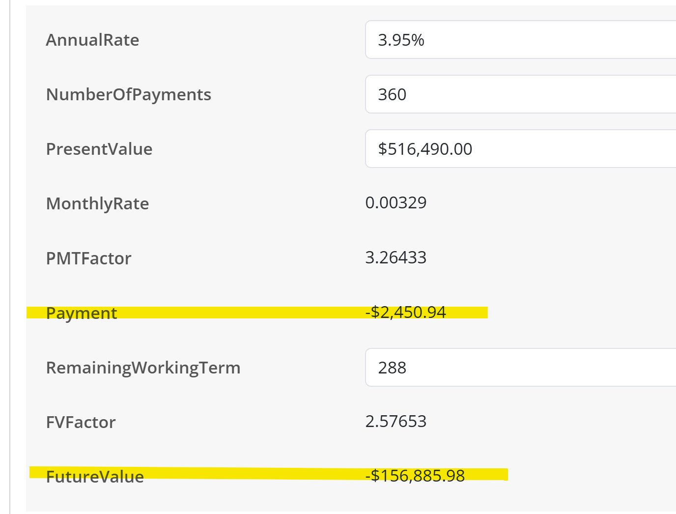 - (<<PresentValue>> * <<PMTFactor>>) * <<MonthlyRate>> / (<<PMTFactor>> - 1)