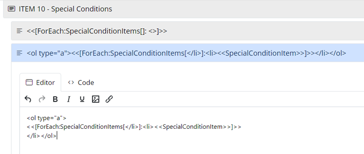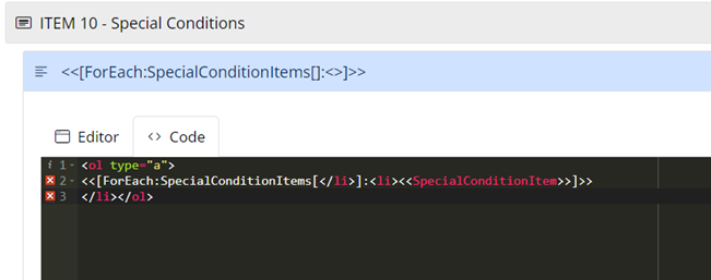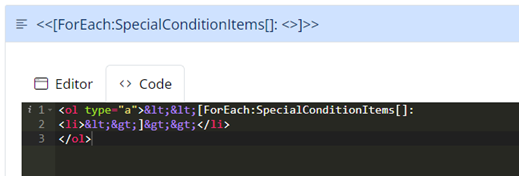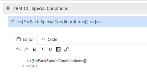 I need to output special condition items as Display Content in a form. The items are from a repeater item, so there may be one item, or there could be 10. Ideally I’d like the items output as an alpha list. This is the syntax I’m trying to add to the Display Content in the form: